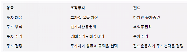 조각투자와 펀드의 차이점을 요약하면 다음과 같습니다.