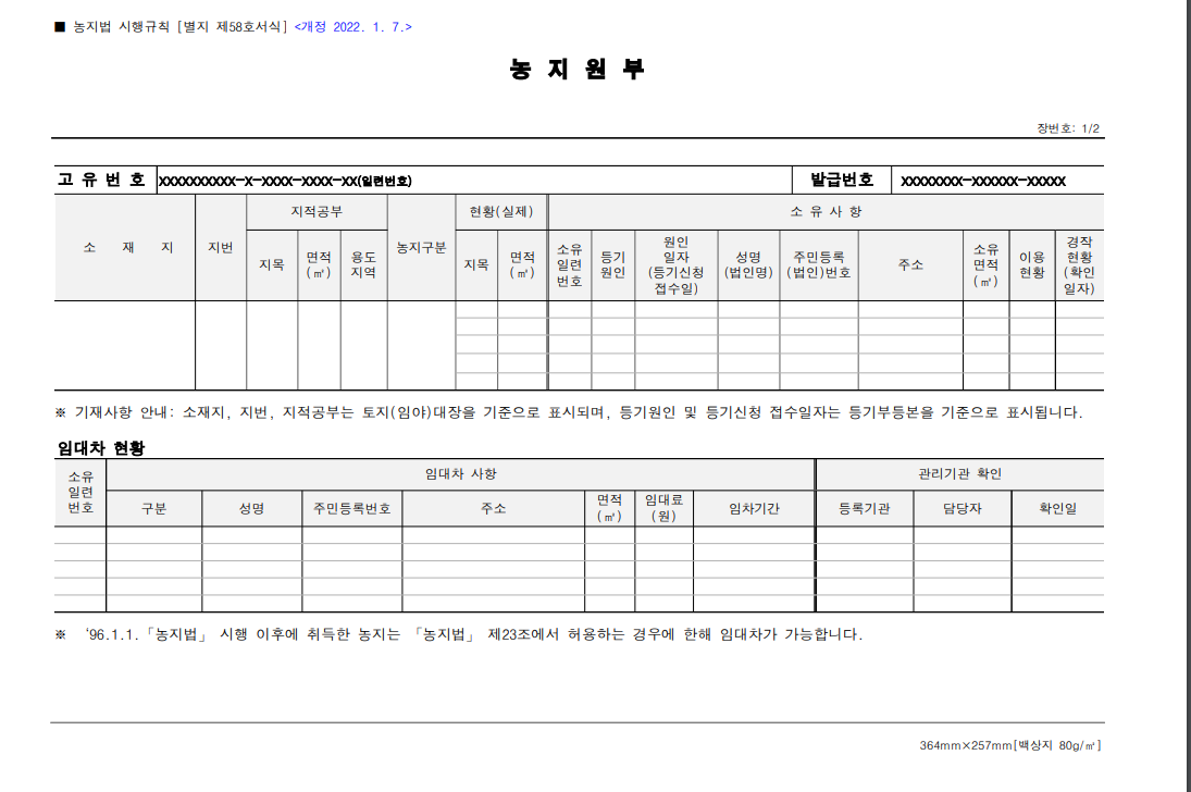농지원부 서식이 변경되어서 22년 4월 15일부로 새로운 양식으로 변경이 되었다.