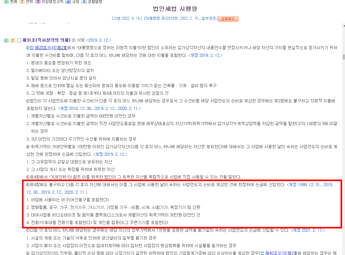 *법인세법시행령 제31조 제6항에 따르면 다음의 자산에 대해서는 이를 그 사업에 사용한 날이 속하는 사업연도의 손금으로 계상한 것에 대하여 손금에 산입합니다.